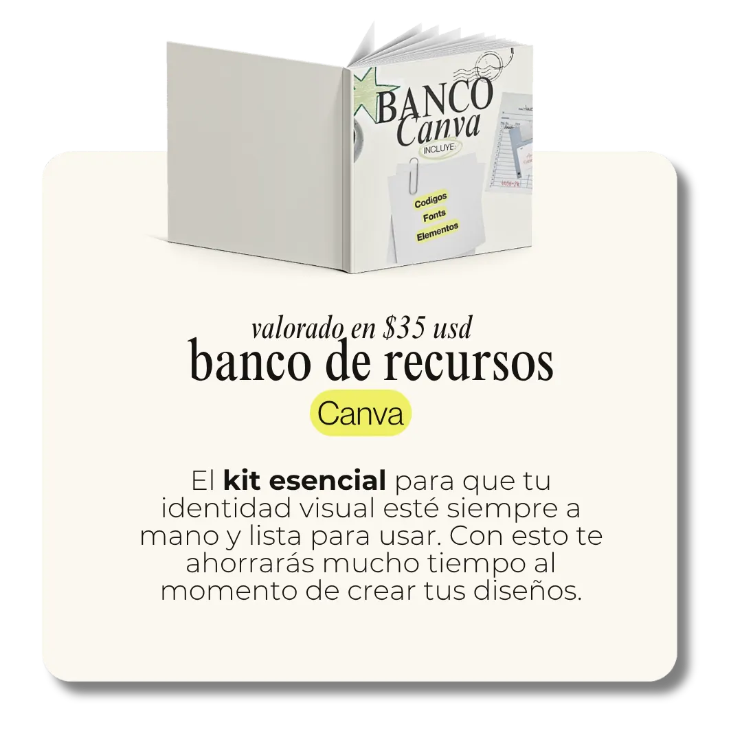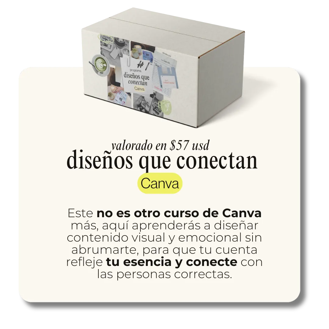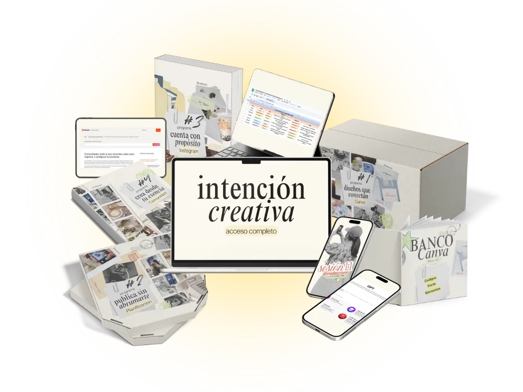 Incluye 4 cursos completos (Diseños que conectan, Publica sin abrumarte, Cuenta con propósito y Crea desde tu esencia), un banco de recursos de Canva, una sesión 1:1 personalizada con Nideconi y 3 bonos exclusivos para las primeras compras: calendario de contenido, asistente GPT de ideas y acceso a la comunidad creativa.